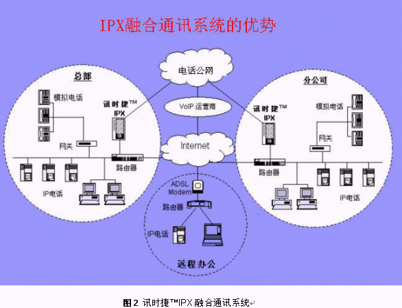 將訊時捷?IPX放在公司總部,其它分支機(jī)構(gòu)可以通過IP話機(jī),軟電話或者網(wǎng)關(guān)設(shè)備登錄到總部的IPX上,這樣就形成了整個公司的VOIP網(wǎng),建立了企業(yè)自己的通訊平臺。