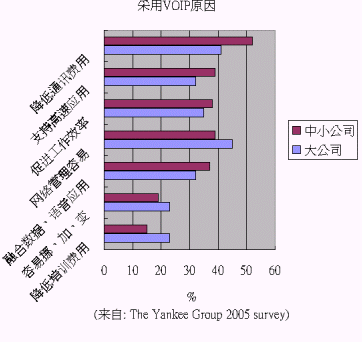 根據(jù)美國著名的咨詢公司 The Yankee Group 2005 年的調(diào)研各企業(yè)使用VOIP的原因,大企業(yè)與中小企業(yè)略有差異:大企業(yè)認(rèn)為網(wǎng)絡(luò)管理、省錢、促進(jìn)工作效率為最關(guān)鍵的三個原因;中小企業(yè)則認(rèn)為省錢、網(wǎng)絡(luò)管理容易、支持高速應(yīng)用、促進(jìn)工作效率為主要原因。