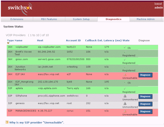 圖5中綠色表示正常,紅色表示出現(xiàn)問題,白色表示從沒有接通過。如果你按診斷(Diagnose),系統(tǒng)便會通過自動測試,告訴你問題出自哪一部分。如果需要對每一個的詳細(xì)解析,可以按底部Why這個標(biāo)題,找尋答案。類似的終端、話機(jī)等配置、硬件診斷等,也有非常明了的界面與解決問題的辦法。