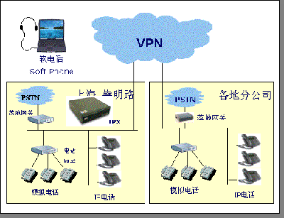 虛擬辦事處/分公司: 企業(yè)沒有常駐辦公機構(gòu)的地區(qū),可以通過 IPX 系統(tǒng)將用戶的電話咨詢通過 INTERNET 傳輸?shù)娇偛刻幚。?dāng)?shù)卦O(shè)置一套網(wǎng)絡(luò)電話終端