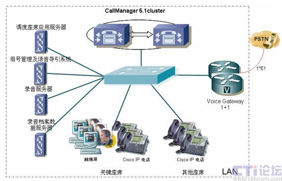 正音科技電話控制調(diào)度系統(tǒng)充分利用現(xiàn)有首都機(jī)場的IP網(wǎng)絡(luò)及通信資源,以IP電話系統(tǒng)為基礎(chǔ),構(gòu)建電話調(diào)度系統(tǒng)基礎(chǔ)網(wǎng)絡(luò)。電話控制系統(tǒng)主要由兩部分組成,其中包括由CallManager、語音網(wǎng)關(guān)、IP電話構(gòu)成的底層IP通信系統(tǒng);在此基礎(chǔ)上,還有正音科技為首都國際機(jī)場開發(fā)的電話調(diào)度控制應(yīng)用軟件系統(tǒng)以及與應(yīng)急救援警示系統(tǒng)等集成的接口。