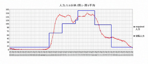 有時(shí)候也會(huì)畫(huà)一張一整個(gè)月的電話量和人力比較圖,一般是禮拜一和二的電話最多,也就是把每天的電話總量和上班的人力做個(gè)比較,畫(huà)出一條每天的曲線圖。