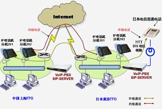上海愛吉研發(fā)的VoIP-PBX軟交換系統(tǒng)已經(jīng)成功地在上海愛吉和日本愛吉以及日本的客戶間實施。目前應(yīng)用上海愛吉生產(chǎn)的VoIP-PBX產(chǎn)品,可以實現(xiàn)從上海愛吉的任意IP電話機撥打內(nèi)部分機號,例如:101,成功實現(xiàn)從Internet互聯(lián)網(wǎng)接通位于日本東京的日本ITG或日本OKI公司的IP電話機,而不產(chǎn)生任何的電信費用。另外,目前通過日本的NTTINS 交換機,還實現(xiàn)了從上海愛吉的IP電話機可以撥打日本方面的任意普通電話,即日本電信范圍內(nèi)的任意普通電話,而僅僅產(chǎn)生從日本ITG到日本其它地方的短途或國內(nèi)長途費用,而沒有上海到日本的國際長途費用。具體的網(wǎng)絡(luò)應(yīng)用圖如下所示: