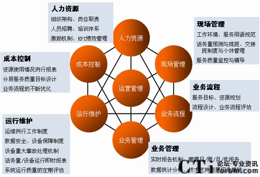 一般來講,呼叫中心的運(yùn)營(yíng)管理由人力資源、現(xiàn)場(chǎng)管理、成本控制、運(yùn)行維護(hù)、業(yè)務(wù)管理、業(yè)務(wù)流程六種要素組成。這六者之間的關(guān)系正如下圖所示: