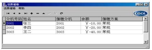 催繳調(diào)度表中的%欠費%,用戶可以從計費系統(tǒng)的月報表中提出(用戶輸入月份,自動根據(jù)催繳電話取過來);也可由用戶再次修改(針對所欠不是一個月的費用),但“刷新”又從從計費系統(tǒng)的月報表中更新數(shù)據(jù)。