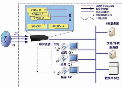 一體化板卡方案是用勤針對(duì)企業(yè)級(jí)用戶而專門(mén)量身定制的呼叫中心產(chǎn)品,主要由工業(yè)用控制計(jì)算機(jī)(工控機(jī))加插語(yǔ)音板卡以及板卡的驅(qū)動(dòng)控制軟件實(shí)現(xiàn)電話語(yǔ)音交換機(jī)能力。綜合語(yǔ)音工作站相當(dāng)于一臺(tái)小的交換機(jī),內(nèi)置 CTI 控制、 ACD 排隊(duì)、 IVR 、錄音等功能。組網(wǎng)方式: