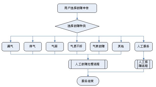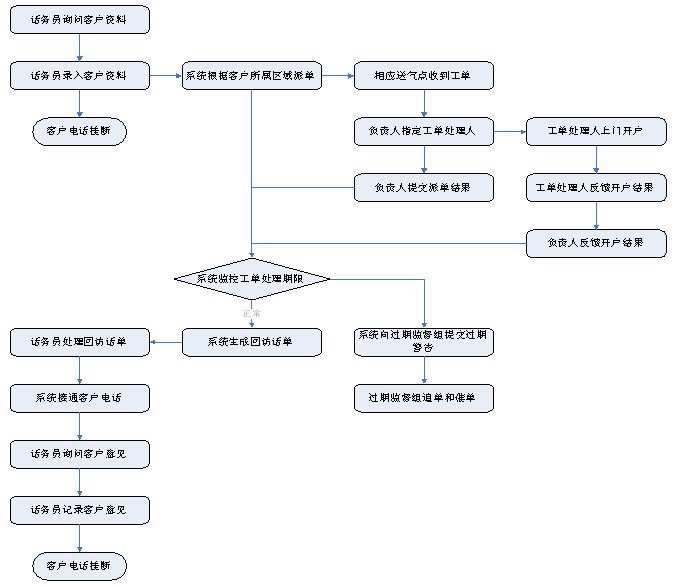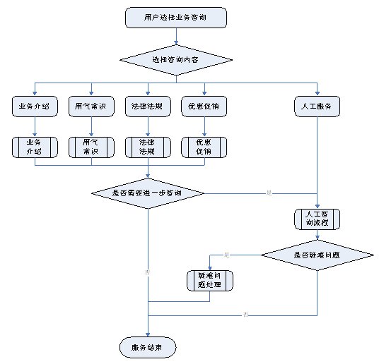 1)業(yè)務(wù)咨詢:用戶通過(guò)人工、自動(dòng)語(yǔ)音等方式咨詢有關(guān)政策法規(guī)、資費(fèi)標(biāo)準(zhǔn)、用氣常識(shí)、報(bào)裝方法等,系統(tǒng)以語(yǔ)音、傳真、Email、短消息等方式回復(fù)客戶。