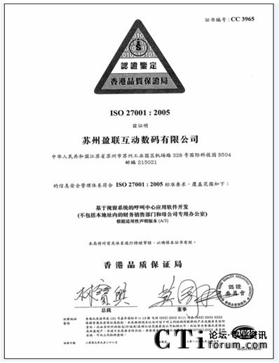 蘇州盈聯(lián)通過(guò)ISO27001:2005信息安全管理體系認(rèn)證