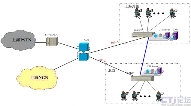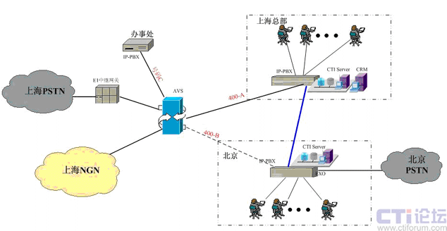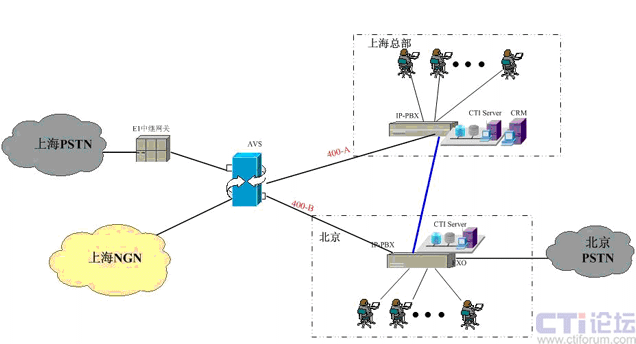 在上海采用傲威通信的AVS軟交換平臺實現(xiàn)VoIP呼叫系統(tǒng)的主叫識別,決定呼叫路由的選定。在上海和北京分別建設(shè)IP-PBX和CTI呼叫系統(tǒng),在各辦事處或分公司可根據(jù)選擇是否要建設(shè)坐席或普通電話系統(tǒng),所有節(jié)點的呼入呼出統(tǒng)一從上海出口實現(xiàn)出入。