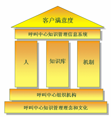 如上圖呼叫中心知識(shí)管理大廈。其是建立在呼叫中心知識(shí)管理理念文化、組織機(jī)構(gòu)基礎(chǔ)上,以人、知識(shí)庫、機(jī)制為核心,通過呼叫中心知識(shí)管理信息系統(tǒng)承載實(shí)施,以提高客戶滿意度為目的的綜合系統(tǒng)。
