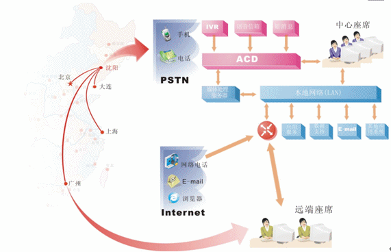 對于地區(qū)分布廣泛,而又要集中管理的企業(yè),可在各個局部地區(qū)設(shè)置遠(yuǎn)端座席,并通過網(wǎng)絡(luò)方便的接入中心系統(tǒng)。我們?yōu)檫h(yuǎn)端座席提供與中心座席完全相同的操作,遠(yuǎn)端座席可以根據(jù)各個地區(qū)的特定情況有針對性的處理各個局部地區(qū)的業(yè)務(wù),為中心分流壓力,同時中心系統(tǒng)也可以完全掌握遠(yuǎn)端座席的情況。我們可以非常明確的一點是:采用分布式座席的技術(shù),使得遠(yuǎn)端座席與中心座席除了地域上的差異,其它部分完全相同?梢哉f只要網(wǎng)絡(luò)無極限,座席分布就是無極限的。