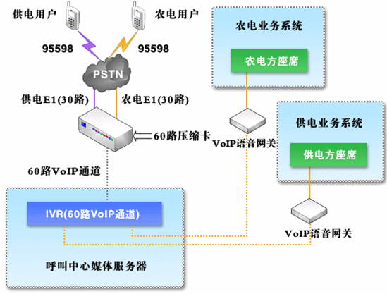 對于呼叫中心系統(tǒng),由95598特別號碼統(tǒng)一接入,并且在供電呼叫中心系統(tǒng)與農(nóng)電呼叫中心系統(tǒng)之間采用中繼方式(模擬中繼或者數(shù)字中繼,視農(nóng)電方實(shí)際情況而定)進(jìn)行話路連接,同時(shí)保證系統(tǒng)接入容量及其他資源能夠滿足統(tǒng)一的要求;在自動(dòng)語音菜單中,分別設(shè)立供、農(nóng)電用戶層,用戶可以自行區(qū)分、選擇,對于農(nóng)電用戶在確定用戶類型之后,通過中繼將話路轉(zhuǎn)接到農(nóng)電方呼叫中心系統(tǒng)。