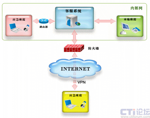 配置應(yīng)急座席的必要條件之一是網(wǎng)絡(luò)環(huán)境,要求應(yīng)急座席家庭計算機(jī)能夠連接到Internet或能夠直接訪問客服系統(tǒng)內(nèi)部網(wǎng)絡(luò),位于客服網(wǎng)絡(luò)防火墻之外需要通過相應(yīng)的技術(shù)連接到系統(tǒng),實(shí)現(xiàn)對系統(tǒng)的訪問。
