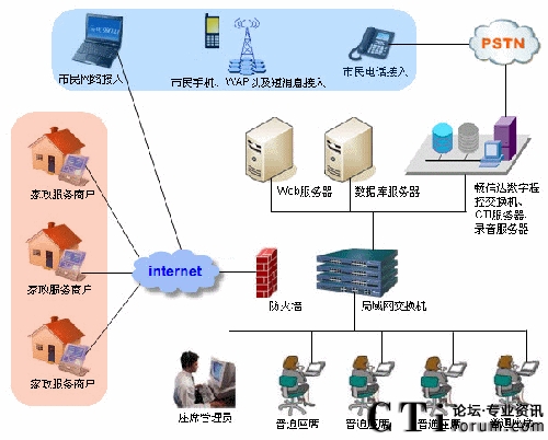 隨著國內(nèi)城市化地不斷加快,人口老齡化的加劇,人民群眾對家政服務需求也越來越旺盛,家政服務業(yè)的重要性也日益凸顯。為了規(guī)范家政服務市場、整合家政市場資源、培育家政服務示范性企業(yè),國家商務部、財務部于2009年4月下發(fā)了《關(guān)于推進家政服務網(wǎng)絡體系建設(shè)的通知》的149號文件,啟動了家政服務網(wǎng)絡中心體系建設(shè)的項目,并提出了具體的規(guī)范和要求。以此為起點,為更好地服務社會滿足人民群眾日益增長的生活需求而努力。自文件下發(fā)以來,我公司就組織專門的項目組,對家政服務行業(yè)具體業(yè)務需求的調(diào)研以及開發(fā)工作。公司利用多年的開發(fā)經(jīng)驗,經(jīng)過幾個月的努力,終于在8月份完成了暢信達家政服務網(wǎng)絡中心的全套建設(shè)方案。與其它系統(tǒng)固化的功能設(shè)計不同,該方案可以靈活地定制業(yè)務模塊,方便各地的家政公司根據(jù)本市的情況和需求,確定適合自身的業(yè)務流程。系統(tǒng)業(yè)務模塊完整地覆蓋了家政服務的業(yè)務范圍與重點。并將家政服務的業(yè)務分為營業(yè)系統(tǒng)、賬務系統(tǒng)、后臺系統(tǒng)等部分,貫穿了市民從訴求提交、工單派發(fā)、工單處理、財務結(jié)算到回訪反饋的各個方面。系統(tǒng)還提供了完善的報表模塊準確反映業(yè)務和系統(tǒng)運營狀況,有力地支持對平臺進行運營管理工作。另外在方案設(shè)計上,除了滿足業(yè)務處理需要外,還充分考慮到系統(tǒng)的適應性、穩(wěn)定性和處理的能力。首先為了滿足各地市對家政平臺的不同需求,公司專門推出了基于IBM服務器的和暢信達標配服務器的兩種建設(shè)方案。暢信達標配服務器方案可提供最低4模擬外線最多1條數(shù)字中繼(E1)接入,適用于初期規(guī)模較小且投資規(guī)模不大的客戶。而基于IBM服務器的方案,則主要是滿足業(yè)務量較大,同時對設(shè)備配置要求高的城市,以數(shù)字線接入為主。多種建設(shè)模式充分體現(xiàn)了方案的靈活性、可擴展性的特征,有效地減少了運營風險,提升了個性化定制化服務的水平。其次,根據(jù)家政市場需求預測以及已開通家政服務網(wǎng)絡中心城市的實際運營情況,一個中型城市,預計電話開通之后,話務量平均每天近3000個,這就要求系統(tǒng)不但有穩(wěn)定的性能而且要有強大的處理能力。我公司從系統(tǒng)平臺構(gòu)建、業(yè)務流程設(shè)計、設(shè)備性能、組網(wǎng)設(shè)計等方面著手,為系統(tǒng)提供了足以確保安全穩(wěn)定運行的支持。