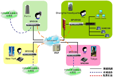 隨著公司在全世界開設(shè)眾多的部門,IP電話技術(shù)將會(huì)是不同分公司之間實(shí)現(xiàn)低費(fèi)用高品質(zhì)語音通訊的方式。SINOCO公司的IP-PBX 系統(tǒng)解決方案,利用 SPX-5130設(shè)備通過互連網(wǎng)連接到公司的各個(gè)分支機(jī)構(gòu),提供分級(jí)體系結(jié)構(gòu),更進(jìn)一步提供了可靠的,靈活的語音通訊解決方案,從而滿足公司快速回應(yīng)客戶的需求。同時(shí),它也降低了總部和分部之間的電話費(fèi)用。總部和分部間昂貴的國際電話費(fèi)用將不再存在, 而且享受高品質(zhì)的語音通訊質(zhì)量。