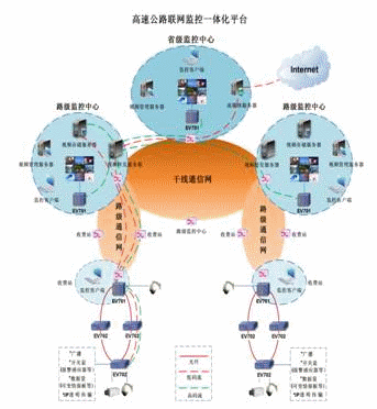 采用H.264編碼標(biāo)準(zhǔn)的EV702外場綜合接入設(shè)備,將原來外場分散的攝像頭、快球、云臺、可變情報板、報警感應(yīng)器等設(shè)備融為一體,同時也支持MPEG編碼標(biāo)準(zhǔn)的視音頻接入。EV702配備光纖通信板卡,不需要光端機(jī),可以直接連接光纖,進(jìn)行遠(yuǎn)距離。通過EV702連接成環(huán),并且具有自愈功能?蛇M(jìn)行集中式(路級監(jiān)控中心)、分布式(各級監(jiān)控中心)存儲。路級中心、區(qū)域中心、省級中心分布式多級監(jiān)控,由省中心統(tǒng)一設(shè)定權(quán)限,進(jìn)行集中管理。