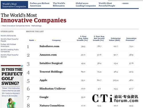 CTI論壇(ctiforum)8月15日消息(記者 張潔):2011年7月,由美國知名財經(jīng)雜志《福布斯》評選出的全球百大最具創(chuàng)新能力企業(yè)排行榜上,salesforce.com超越Facebook、蘋果、亞馬遜等知名企業(yè)位列第一。