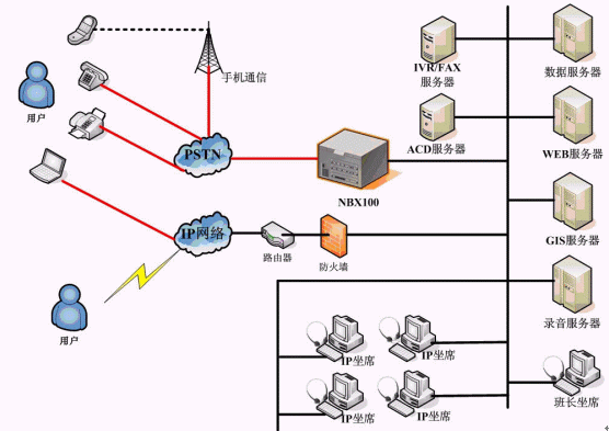 求助中心熱線系統(tǒng)采用華為-3COM 的 NBX100 網(wǎng)絡交換機作為呼叫接入設備,基于純IP交換技術(shù),座席電話全部采用IP話機,部署方式靈活。求助中心系統(tǒng)主要負責受理市民投訴,并派發(fā)到相關(guān)二級網(wǎng)絡單位;網(wǎng)絡單位系統(tǒng)主要負責處理中心下發(fā)的投訴單據(jù),并進行反饋,同時,網(wǎng)絡單位也可自行受理投訴,并進行相應的上傳和下發(fā),多級網(wǎng)絡單位之間可實現(xiàn)級聯(lián)。為了簡化單據(jù)中轉(zhuǎn)流程,求助中心系統(tǒng)在網(wǎng)絡派單的基礎(chǔ)上,還結(jié)合自動傳真、短信群發(fā)等技術(shù),提供了自動傳真派單、自動短信派單等多種單據(jù)派發(fā)功能,極大的提高了單據(jù)處理效率。