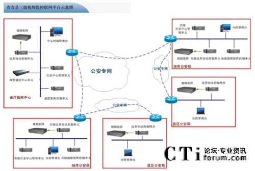在省廳到地市之間配置視頻監(jiān)控聯(lián)網(wǎng)平臺(tái)中的核心管理調(diào)度單元、專用視頻終端、CS中心GIS控制客戶終端、邊界標(biāo)準(zhǔn)協(xié)議控制單元,地市核心管理調(diào)度單元、級(jí)聯(lián)矩陣控制中心單元、網(wǎng)管通信中心單元、中心音頻ACU調(diào)度單元、邊界標(biāo)準(zhǔn)協(xié)議控制網(wǎng)關(guān)、CS中心GIS控制客戶終端、通用型數(shù)字矩陣解碼陣列、通用標(biāo)準(zhǔn)控制矩陣鍵盤等組件構(gòu)建省至地市級(jí)公安監(jiān)控聯(lián)網(wǎng)系統(tǒng)。