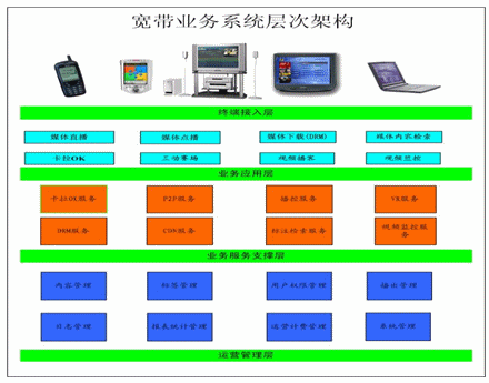 提供多種寬帶業(yè)務(wù)產(chǎn)品包,如網(wǎng)絡(luò)卡拉OK業(yè)務(wù),持網(wǎng)絡(luò)視頻播客業(yè)務(wù),網(wǎng)絡(luò)視寬頻視野業(yè)務(wù),也可根據(jù)用戶需求定制拓展業(yè)務(wù)如遠(yuǎn)程教學(xué)業(yè)務(wù),網(wǎng)絡(luò)音像發(fā)行出版業(yè)務(wù)(數(shù)字版權(quán)保護),網(wǎng)絡(luò)電視臺業(yè)務(wù),多媒體辦公業(yè)務(wù)等。