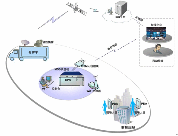 MDS調(diào)度機通過衛(wèi)星道與政府的NGN平臺對接,實現(xiàn)與整個城市的通信系統(tǒng)對接;并通過GSM、CDMA備份線路,實現(xiàn)多通信通道的實時切換,選擇最好的路由進行通信。MDS調(diào)度機負責語音通訊、調(diào)度作業(yè)和指令消息轉(zhuǎn)發(fā);應急指揮車配備調(diào)度機、調(diào)度臺、移動調(diào)度終端、衛(wèi)星接收設備、監(jiān)控視頻設備及其他設備。所有的調(diào)度語音終端都可與MDS調(diào)度系統(tǒng)對接,實現(xiàn)調(diào)度功能及與其他的通信終端進行通信。