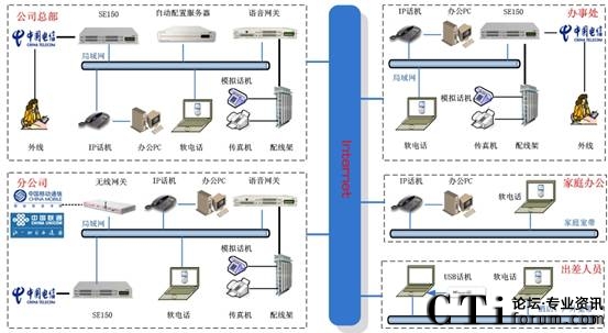 分布式部署:總部和各分支機(jī)構(gòu)的分機(jī),是通過IP網(wǎng)絡(luò)融合在一個(gè)語(yǔ)音平臺(tái)上來實(shí)現(xiàn)內(nèi)部通信?偛亢娃k事處分機(jī)、家庭辦公分機(jī)、出差人員的軟電話均注冊(cè)在總部的SE150上,各分公司的分機(jī)注冊(cè)在本地的SE150上,由本地的SE150管理。