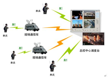 在具體應(yīng)用中,工作人員(士兵)攜帶單兵背負終端深入現(xiàn)場(災(zāi)區(qū)、廣場、戰(zhàn)場等),將現(xiàn)場視頻實時回傳到后方的應(yīng)急通信車或指揮中心,同時現(xiàn)場人員可以和指揮中心建立雙向語音通信,指揮中心根據(jù)現(xiàn)場真實的視頻信息并結(jié)合現(xiàn)場人員語音匯報,可以做出更有針對性、更具準確性的指揮決策。
