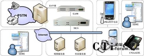 1)由MCS與該企業(yè)原有的大型傳統(tǒng)PBX進(jìn)行對(duì)接,MCS主要處理語(yǔ)音交換,具備IP-PBX和VOIP網(wǎng)關(guān)的功能,還具有IVR(交互式語(yǔ)音應(yīng)答)和ACD(自動(dòng)呼叫分配)等呼叫中心功能,并為SEME提供服務(wù)。