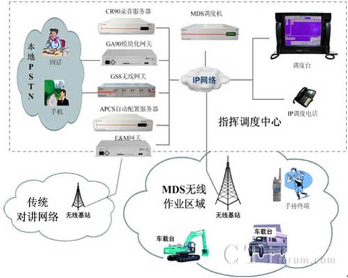 MDS系統(tǒng)可以應用于各種作業(yè)現(xiàn)場的指揮調(diào)度, MDS系統(tǒng)不但支持系統(tǒng)基本的語音通信,調(diào)度中心可以通過視頻、數(shù)據(jù)、文本消息等綜合的多媒體方式與作業(yè)人員進行通信交互,滿足各種復雜環(huán)境下的指揮調(diào)度需求。系統(tǒng)可以通過GS8無線網(wǎng)關(guān)、GA90