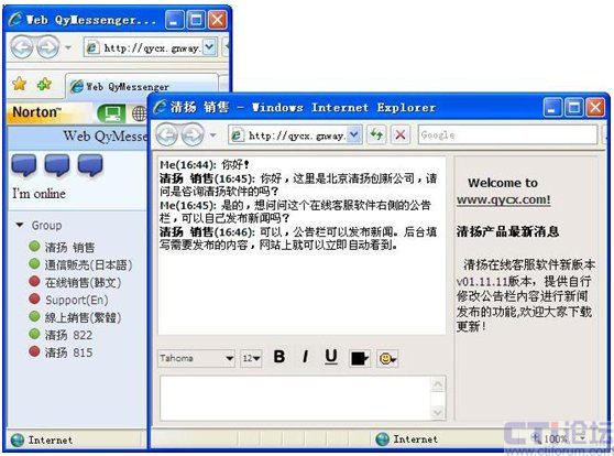 Web即時(shí)通信,對(duì)任意地方的客戶,是用IE即可以訪問"對(duì)話"。所以,它虛擬出一個(gè)銷售人員的接觸途徑。