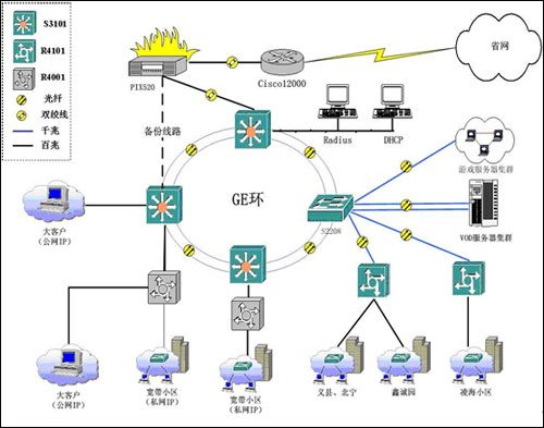 在城域網(wǎng)的核心節(jié)點(diǎn)下可放置多臺(tái)接入服務(wù)器,單臺(tái)R4000接入服務(wù)器可同時(shí)為多個(gè)小區(qū)的用戶提供接入服務(wù),提供多種認(rèn)證方式(包括WEB認(rèn)證、PPPoe認(rèn)證、802.1x認(rèn)證)從而形成以點(diǎn)帶面的應(yīng)用格局?紤]到最大程度上保證用戶的使用習(xí)慣和減小網(wǎng)絡(luò)維護(hù)工作量等因素,全部使用基于IE瀏覽器的Web認(rèn)證方式,配合城域網(wǎng)的Radius服務(wù)器能為用戶提供分布式的認(rèn)證控制和集中的計(jì)費(fèi)功能。