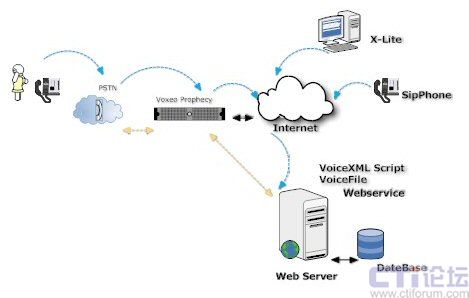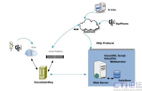 用戶首先通過固定電話或者手機傳統(tǒng)方式向Prophecy 提出請求,Prophecy我們可以理解為Voice Browser,使用者可以存取Internet