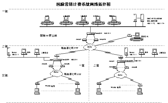 一級為計(jì)費(fèi)中心,位于國脈大廈內(nèi),作為整個系統(tǒng)的運(yùn)行中心和數(shù)據(jù)中心,也是整個系統(tǒng)的樞紐。二級主要位于二個營業(yè)室,是整個系統(tǒng)的分中心。三級為各營業(yè)所和代銷點(diǎn),分散在全市各處是整個系統(tǒng)的數(shù)據(jù)基礎(chǔ)。