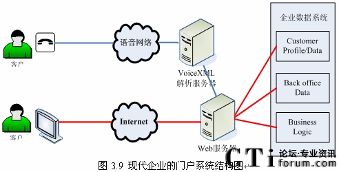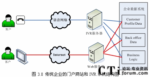隨著Internet和Web技術的迅速發(fā)展,越來的企業(yè)開始建立自己的門戶網(wǎng)站,同時又擁有自己的IVR系統(tǒng)(如圖3.8所示),但是兩套系統(tǒng)完全獨立,語音系統(tǒng)和數(shù)據(jù)系統(tǒng)沒有任何交互或者只有很少的交互。而建立IVR系統(tǒng)的目標就是給客戶更好的體驗,使客戶能方便的通過電話完成更多以前需要登陸企業(yè)門戶網(wǎng)站,或者親自去企業(yè)或其網(wǎng)點去辦理的業(yè)務,這就需要IVR系統(tǒng)能跟后臺數(shù)據(jù)系統(tǒng)有更多更好的交互。“語音門戶”的概念出現(xiàn)也愈發(fā)的證明這一點。