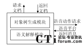 作為VoiceXML語言的解釋工具,文檔解析是VoiceXML解析器主要任務,也是執(zhí)行引擎的重要組成部分,文檔解析的內(nèi)容決定了執(zhí)行平臺的下一步操作,也是整個系統(tǒng)運行的核心。因為VoiceXML文檔首先是一個XML文檔,所以主要包含對象樹生成模塊和語義解釋模塊兩個部分。其中對象樹生成模塊是對VoiceXML文檔進行XML方式的解析,解釋模塊使用FIA算法對生成的對象進行解析。圖3.13描述了VoiceXML解析器文檔解析的模型。