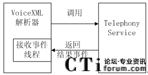 當VoiceXML解析器做完解析工作之后,遇到需要語音操作時,就得依靠調(diào)用Telephoney API來完成,同時Telephony Service需要向VoiceXML解析器去返回相應的語音操作結果事件。圖3.15描述了這一過程。