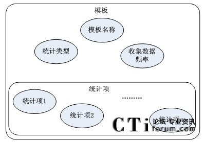 由模板結(jié)構(gòu)框架圖得知,模板包括模板名稱,數(shù)據(jù)統(tǒng)計對象,收集數(shù)據(jù)的頻率和多個基本統(tǒng)計項。其中,每個統(tǒng)計項對應(yīng)著統(tǒng)計對象(如:坐席,路由點等)的一條統(tǒng)計內(nèi)容信息(如:1小時內(nèi)的呼叫總量等)。然后由這些統(tǒng)計項和統(tǒng)計參數(shù)組合成模板,從而構(gòu)成對呼叫中心對象的統(tǒng)計信息。