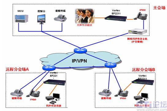 當(dāng)視頻會(huì)議召開時(shí),主會(huì)場的翻譯既通過同聲傳譯系統(tǒng)把翻譯好的內(nèi)容傳輸?shù)奖镜氐呐c會(huì)者,也通過IP音頻會(huì)議系統(tǒng)把翻譯好的內(nèi)容傳輸?shù)竭h(yuǎn)端的會(huì)場,遠(yuǎn)端會(huì)場把音頻系統(tǒng)傳輸過來的聲音經(jīng)過EF2211聲音處理系統(tǒng)處理后傳輸?shù)酵晜髯g系統(tǒng),同聲傳譯系統(tǒng)把聲音經(jīng)無線耳機(jī)傳送給需要的與會(huì)者。這樣遠(yuǎn)端會(huì)場的與會(huì)者既可以聽到主會(huì)場的原聲,也可以聽到翻譯好的內(nèi)容。相反,當(dāng)分會(huì)場發(fā)言時(shí)分會(huì)場也可以把本會(huì)場的原聲和翻譯好的內(nèi)容傳輸?shù)街鲿?huì)場。這樣就可以實(shí)現(xiàn)遠(yuǎn)程同聲傳譯。能同時(shí)滿足與會(huì)的所有人員的翻譯需求,既做到翻譯內(nèi)容的統(tǒng)一,又節(jié)省了翻譯人員的人力成本。