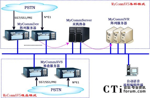 MyCOmmAVS集群模式:將三大核心模塊分布部署,其中MyCommServer核心模塊為雙機熱備,而MyCommDEV和MyCommIVR都設計為集群陣列方案。其優(yōu)勢的集中監(jiān)控和管理,DEV服務器和IVR服務器任何一個節(jié)點的故障都不影響其他系統(tǒng)。