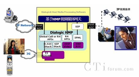 基于Dialogic HMP(Host Media processing)主機(jī)媒體處理技術(shù)的視頻呼叫中心主要通過(guò)網(wǎng)絡(luò)接口卡(“瘦卡”,Digital Network Interface卡)與PSTN(3G)相連。這里的PSTN包括電信、聯(lián)通和移動(dòng)等電信運(yùn)營(yíng)商。也可以通過(guò)H.323、SIP協(xié)議棧直接接受來(lái)自數(shù)據(jù)網(wǎng)絡(luò)的多媒體呼叫。