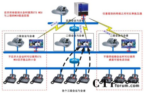 此方案由于使用了簡單而廉價的CTS軟件MCU,讓3級會議與會者接入CTS MCU,然后由CTS MCU再與上級總的MCU做級連,從而省去了在原來總部MCU端增加與會者數(shù)量許可的價格。