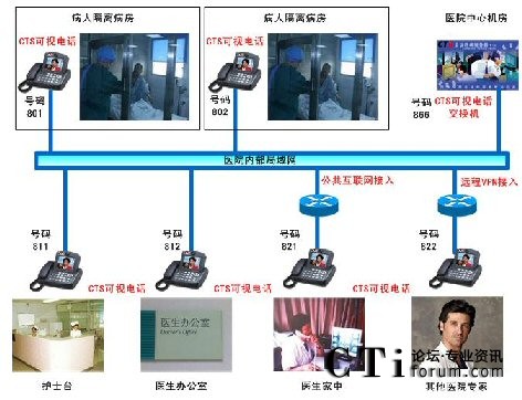 對于隔離病房的觀察,目前的實現(xiàn)可以使用遠程視頻監(jiān)控,或者使用電腦方式來遠程視頻交流。視頻監(jiān)控缺點無法實時與病人交流,使用電腦交流則操作比較繁瑣。CTS提出使用可視電話的方案來彌補當前的缺點:實時與病人交流,可視電話使用操作簡單。