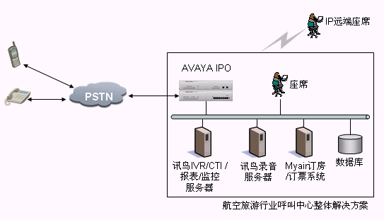 本方案采用AVAYA IP OFFICE系列交換機,通過訊鳥中間件控制整個呼叫中心的電話呼入、呼出。它支持多種聯(lián)絡渠道,包括語音、交互式自動語音應答(IVR)、傳真、電子郵件、web、短消息等,同時利用Myair航空管理系統(tǒng)來完成整個業(yè)務流程。