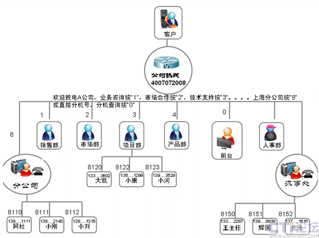 一直以來,呼叫中心座席的形式比較固定,大都通過長期坐在辦公室的人員使用PC機和電話機結(jié)合的方式進(jìn)行工作。但是,這種形式顯然不能滿足中小企業(yè)運營管理的需要,在以銷售為重的中小企業(yè)中大部分人員并不完全坐在辦公室工作,如客戶經(jīng)理、客戶服務(wù)工程師,即使坐在辦公室,也不會一直在等著接電話,如開發(fā)工程師、生產(chǎn)車間的人員等等。如何既要滿足企業(yè)運營的需要,又要實現(xiàn)呼叫的管理和分配呢?我們只需要將座席的形式簡化,將呼叫分配的目標(biāo)擴大就可以了。手機是目前最常見和普遍的通信工具,只要我們將手機做為座席進(jìn)行管理,既不改變現(xiàn)有的組織架構(gòu),又能充分利用呼叫分配工作并對工作人員進(jìn)行管理,這將大大提高中小企業(yè)運營管理的靈活性和變通性。企業(yè)組織架構(gòu)如下: