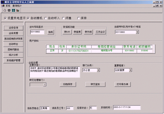 客戶打入電話后,當(dāng)系統(tǒng)的自動語音應(yīng)答子系統(tǒng)無法解決客戶問題時(shí),客戶可選擇人工服務(wù),由企業(yè)客戶服務(wù)代表直接接聽客戶電話,處理并解決客戶問題。此時(shí)客戶同座席話務(wù)人員直接溝通,并同時(shí)記錄下該客戶的聯(lián)系方式,將相關(guān)數(shù)據(jù)添加入系統(tǒng)數(shù)據(jù)庫;也可以在數(shù)據(jù)庫的支持下回答接受查詢卷煙/價(jià)格/限額/新品種、卷煙經(jīng)營規(guī)范制度/卷煙專賣政策法規(guī)咨詢、通報(bào)最近暢銷卷煙的限額情況/通報(bào)最近增加的新品種/煙草公司召集的活動通知、投訴和舉報(bào)違法經(jīng)銷行為、卷煙預(yù)訂、電話訪銷、滿意度調(diào)查等。