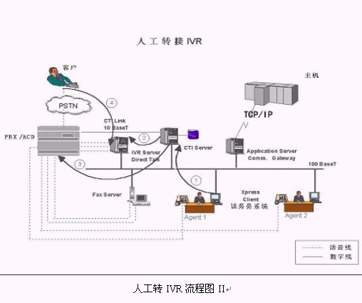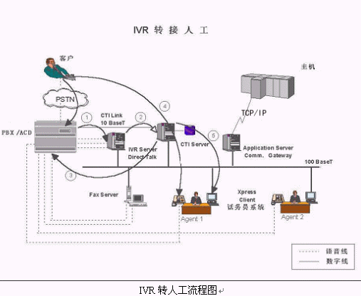 典型的客戶電話從人工服務轉(zhuǎn)接IVR的物理流程如下: