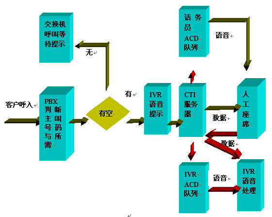 Server,CTI Server控制PBX執(zhí)行轉(zhuǎn)接任務,呼叫進入人工座席ACD隊列排隊,如相關(guān)話務員有空閑,則執(zhí)行轉(zhuǎn)接操作。同時對于有些服務,根據(jù)需要,CTI