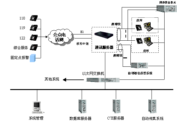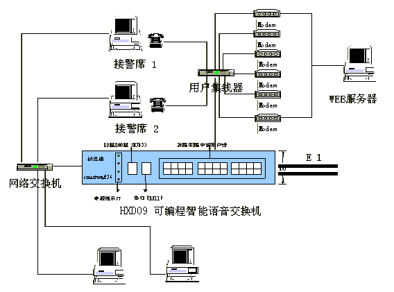 綜合接警平臺(tái)主要由hxd09可編程智能語(yǔ)音交換機(jī)和計(jì)算機(jī)網(wǎng)絡(luò)兩部分組成,交換機(jī)負(fù)責(zé)110、119、122報(bào)警電話的接入與分流及調(diào)度呼出等功能;計(jì)算機(jī)網(wǎng)絡(luò)則完成110、119、122報(bào)警信息的顯示、數(shù)據(jù)儲(chǔ)存、統(tǒng)計(jì)及信息查詢、發(fā)布功能。