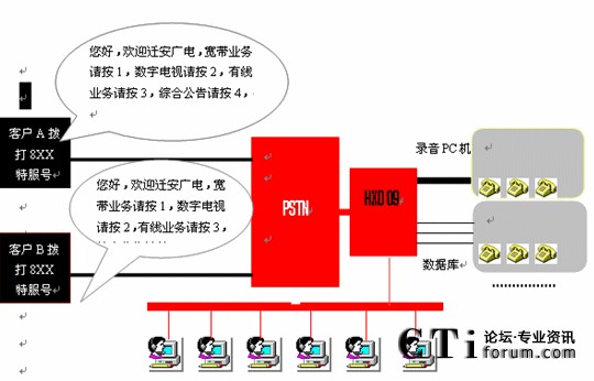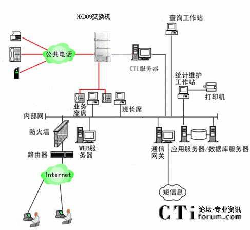 本系統(tǒng)物理結(jié)構(gòu)HXD交換機(jī)、CTI服務(wù)器、IVR(交互式語(yǔ)音應(yīng)答)/IFR(交互式傳真應(yīng)答)服務(wù)器、業(yè)務(wù)代表座席(邏輯上分為:普通業(yè)務(wù)代表座席、專(zhuān)家座席等)、班長(zhǎng)座席、統(tǒng)計(jì)維護(hù)管理工作站、因特網(wǎng)(WEB)服務(wù)器、數(shù)據(jù)庫(kù)/應(yīng)用服務(wù)器、錄音工作站、網(wǎng)絡(luò)系統(tǒng)等構(gòu)成。