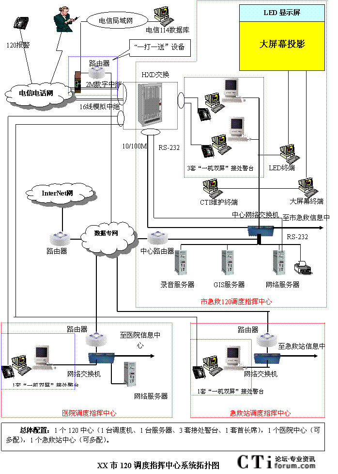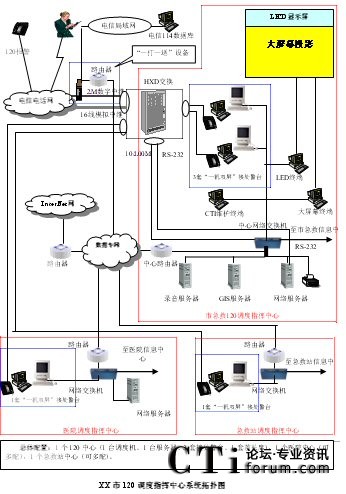 - 樹立大網絡概念:采用先進的通訊、計算機網絡技術(如CTI技術),利用現有的通信資源,實現市人民醫(yī)院120指揮中心與急救分站的計算機網絡及相關領導辦公室計算機大聯網;形成全市范圍內120有線、無線全方位立體調度語音通道大網;為今后督查聯網、大聯動打下基礎。